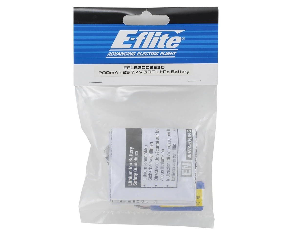This is an E-flite 2S, 30C, 200mAh Li-Poly Battery Pack, intended for small aircraft use.