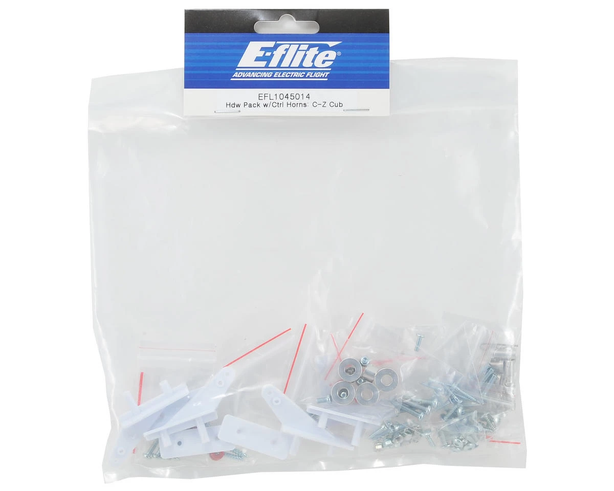 This is a replacement E-flite Control Horn and Hardware Pack. This set includes the necessary control horns, screws, nuts, body clips and other hardware needed for the kit. A great replacement to keep in the tool box!