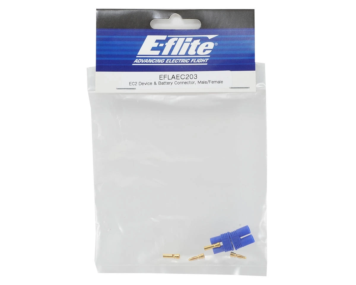 This is an E-flite EC2 Male/Female Connector Set. This set includes one male and one female connector, as well as two male gold interior bullet terminals, and two female gold interior bullet terminals.