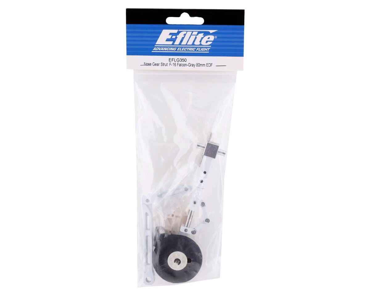 E-flite F-16 Falcon 80mm Nose Gear Strut. This replacement nose gear is intended for the E-flite F-16 Falcon 80mm. Package includes one nose gear with strut and hardware.