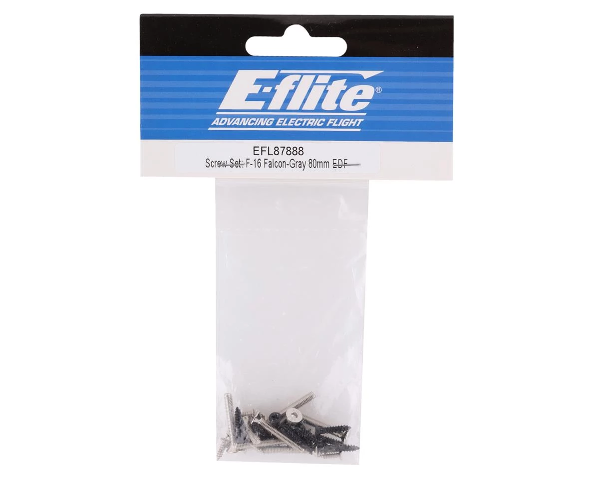 E-flite F-16 Falcon Screw Set. This replacement screw set is intended for the E-flite F-16 Falcon 80mm. Package includes one complete screw set.