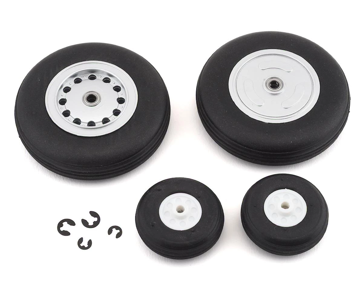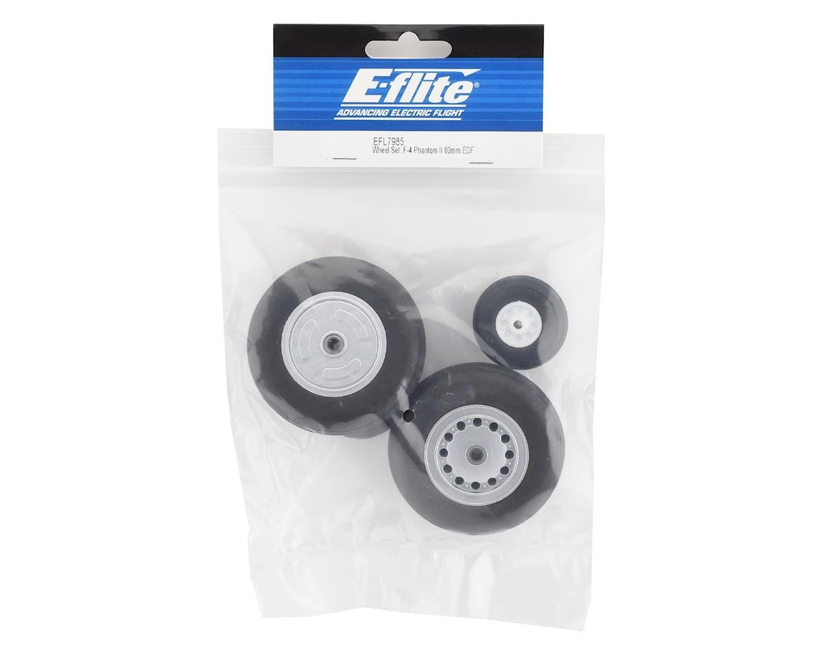E-Flite F-4 Phantom II 80mm Wheel Set. Package contains two replacement small front wheels, two replacement large main wheels and hardware.