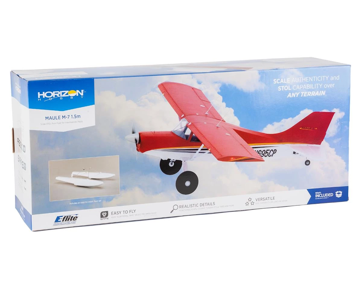 The E-flite® Maule M-7 1.5m captures the Short Take Off and Landing (STOL) capabilities, along with the unmistakable lines and character of the rugged full-scale design series. From the crystal-clear cabin windows and interior detail to an abundance of exterior features including LED lights, antennas, vortex generators and riveted panels, the Maule breaks new ground in park flyer-size civilian scale authenticity. EPO construction results in a lightweight yet durable airframe. The two-piece wing is equipped with operational flaps for outstanding slow flight performance and STOL capabilities. The factory-installed 3S and 4S compatible brushless power system delivers plenty of performance for flying from smooth or rough surfaces using the oversized wheels, or when flying from water using the included float set.