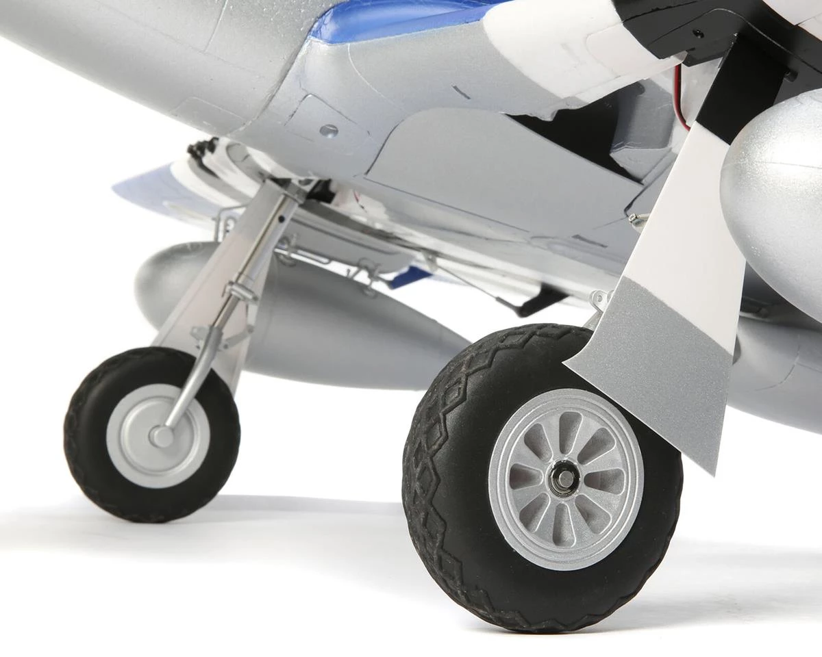 The shock-absorbing struts feature ball-bearing equipped wheels with diamond tread tires for added scale appearance and make it possible to fly from a variety of surfaces including grass, and reliable electric retracts operate the main gear and tailwheel. The factory-installed brushless motor is compatible with 6S LiPo power—simply drop in a 6S 3200-7000mAh battery to achieve level flight speeds in excess of 80+ MPH and unlimited vertical performance. Both versions include a 100-amp Spektrum Avian Smart ESC, and the BNF Basic version is also equipped with an AR637TA receiver that offers full-range telemetry including real-time battery voltage, current, temperature and more to compatible transmitters, plus the advantages of exclusive AS3X and SAFE®Select technologies to make this one of the easiest to fly Mustangs ever.