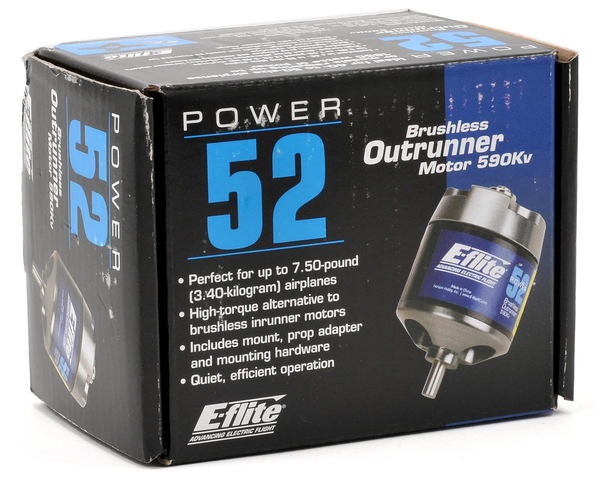 This is the E-flite Power 52, 590kV Brushless Outrunner Motor. Designed to deliver clean and quiet power, the 590kV Power 52 Brushless Outrunner Motor is designed for 40- to 50-size sport and scale airplanes, 40- to 50-size 3D airplanes, as well as models requiring up to 1650 watts of power. The Power 52 is an especially good match for the Hangar 9 Katana 50 (HAN4170).
