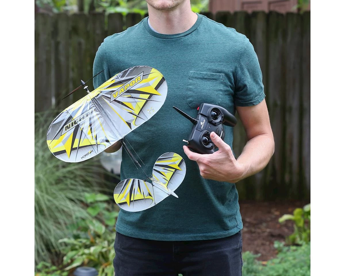 This updated and upgraded UMX Night Vapor has a stronger, reinforced airframe along with more durable metal landing gear that unscrews easily for removal or replacement. The proven power system featuring a stronger prop shaft is compatible with 1S 70mAh to 200mAh LiPo batteries to deliver a wide range of performance and flight time options. Plus, built-in telemetry delivers real-time battery voltage data to compatible transmitters to make you aware of approximately much “power” remains while you fly. Multiple user-selectable color options for the factory-installed LED lights make it possible to personalize the look of your UMX Night Vapor when flying in the night sky. The convenient, all-in-one-box Ready-To-Fly (RTF) includes a transmitter, battery, and charger so you can be flying almost anywhere, day or night, in just the time it takes to charge a battery.