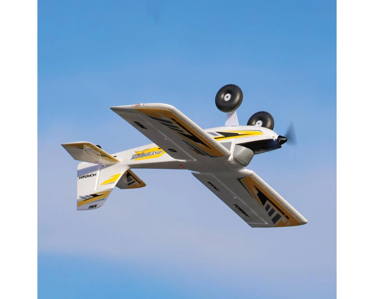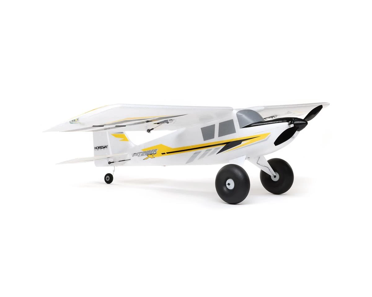 Compared to the ultra-micro Timber models that came before it, its brushless power system features a 3S-compatible outrunner motor and the wing has a shortened span, larger ailerons plus an enlarged elevator and rudder. On low rates, the controls can be smooth and docile. On high rates, they deliver extreme 3D capability — to fly as mild or as wild as you’d like! The full-span ailerons can also be used as flaperons for improved slow flight and STOL performance. Spektrum AS3X and optional-use SAFE Select technologies are included for easier flying, and the control unit/flight controller provides real-time flight battery voltage telemetry and other data to compatible Spektrum AirWare equipped transmitters. Oversized, tundra-style wheels soak up bumps and offer excellent prop clearance. Fly from grass, gravel paths, dirt trails, paved, and other surfaces, outdoors in yards, parks, sports fields and beyond, or indoors in suitable spaces including gymnasiums. Install optional floats (EFLUA1190, sold separately) to add large pools, small ponds, and lakes to your flying site options. Included LED landing, navigation and simulated strobe lights make it possible to fly from earlier to even later in the day. Constructed of advanced EPS material for a lightweight but durable airframe, the UMX Timber X arrives 100% factory-assembled and ready to bind to your 5+ channel DSMX/DSM2 equipped transmitter. That means you can be flying within minutes of opening the box!